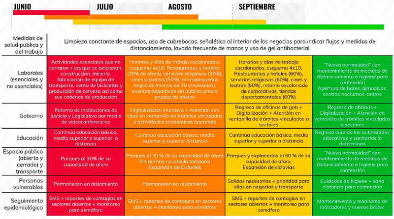 El Gobierno de México declaró el inicio del PLAN GRADUAL hacia la Nueva Normalidad en la Ciudad de Mexico aplicable también a toda la República Mexicana acorde a las normas de reincorporación a las actividades económicas del país y cada estado bajo su gobernatura estatal. La Fase 4 ha sido implementada en el Estado de Mexico – La guardia Nacional DN-III apoya en el seguimiento de la emergencia sanitaria.